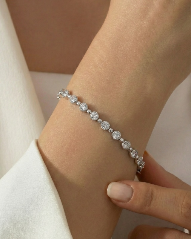 Die gleichmäßige Abfolge der glänzenden Elemente sorgt für eine elegante und ruhige Ausstrahlung, während die funkelnden Oberflächen das Licht auf dezente Weise reflektieren. Durch die flexible Verbindung der einzelnen Glieder passt sich das Armband angenehm an das Handgelenk an und bietet einen leichten Tragekomfort.
