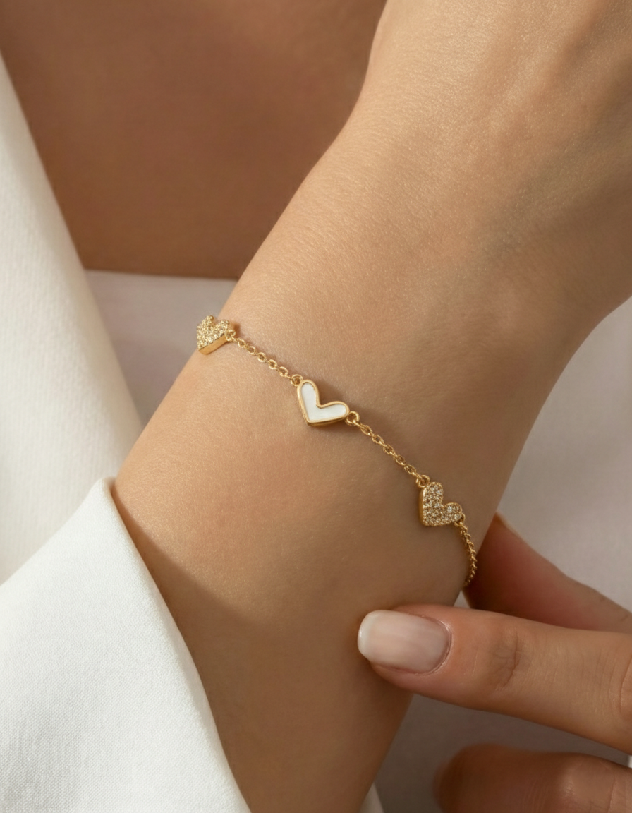 Goldfarbenes Armband mit drei Herzmotiven, darunter ein glattes Herz und zwei steinbesetzte Elemente – zart, elegant und dezent funkelnd.