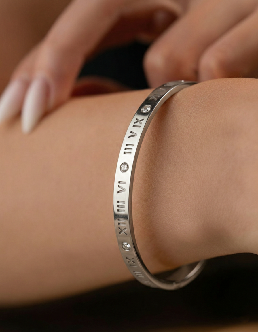 Silberfarbenes Armband mit römischen Ziffern und kleinen funkelnden Details – modern, klar und elegant.