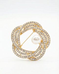 Elegante Brosche mit verschlungenem, goldfarbenem Design und funkelnden Steinchen, veredelt durch eine zentrale weiße Perle – stilvoll und edel.