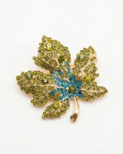 Edle Blatt-Brosche mit funkelnden Steinen in Grüntönen und blauem Akzentzentrum, ergänzt durch einen goldfarbenen Stiel – ein stilvoller, farbintensiver Blickfang.