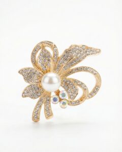 Florale Brosche mit zentraler weißer Perle, goldfarbenen geschwungenen Elementen und funkelnden Steinbesätzen – ein eleganter, strahlender Blickfang.