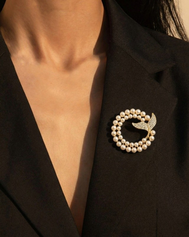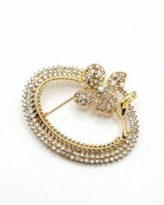 Diese elegante Brosche überzeugt durch ein kunstvoll gestaltetes, kreisförmiges Design mit raffinierter Detailarbeit. Der ovale Rahmen ist in einem warmen Goldton gehalten und von einer fein strukturierten, doppelt wirkenden Umrandung eingefasst, die dem Schmuckstück eine besondere Tiefe und edle Ausstrahlung verleiht.