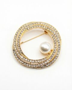 Der Kontrast zwischen den strahlenden, strukturierten Ringen und der ruhigen, glänzenden Oberfläche der Perle unterstreicht die elegante Gesamtwirkung. Diese Brosche eignet sich ideal, um schlichte Outfits aufzuwerten und ihnen einen stilvollen, hochwertigen Akzent zu verleihen.