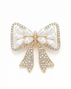Die äußeren Konturen der Schleife sind in einem warmen Goldton gehalten und vollständig mit feinen, glänzenden Steinchen besetzt, die für ein dezentes, gleichmäßiges Funkeln sorgen. Im Inneren der Schleifenbögen sind mehrere längliche, perlenartige Elemente in einem sanften Weißton angeordnet. Diese sind fächerförmig platziert und verleihen dem Schmuckstück eine besondere Struktur sowie eine edle, weiche Optik.