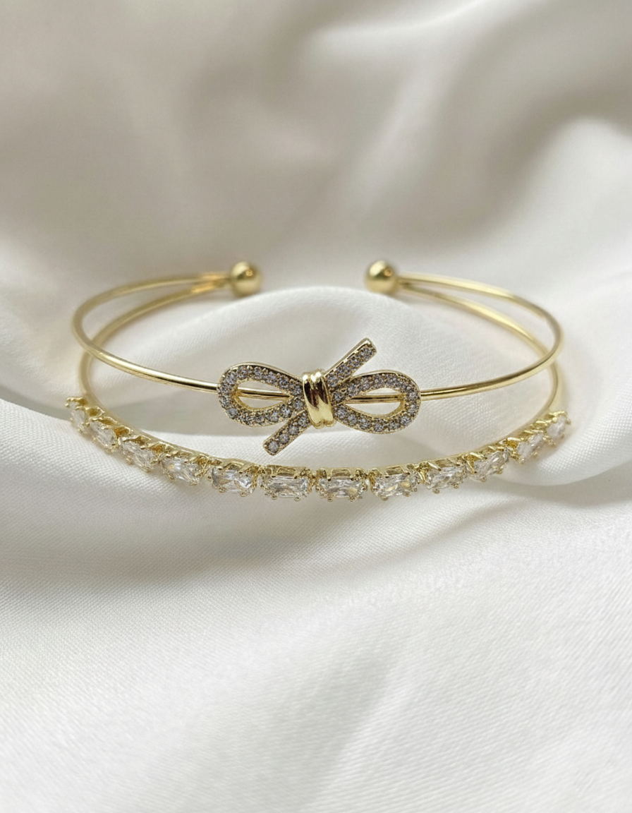Zweiteiliges, goldfarbenes Armreif-Set mit Schleifen-Detail und funkelnden Elementen – elegant, feminin und ein stilvoller Blickfang