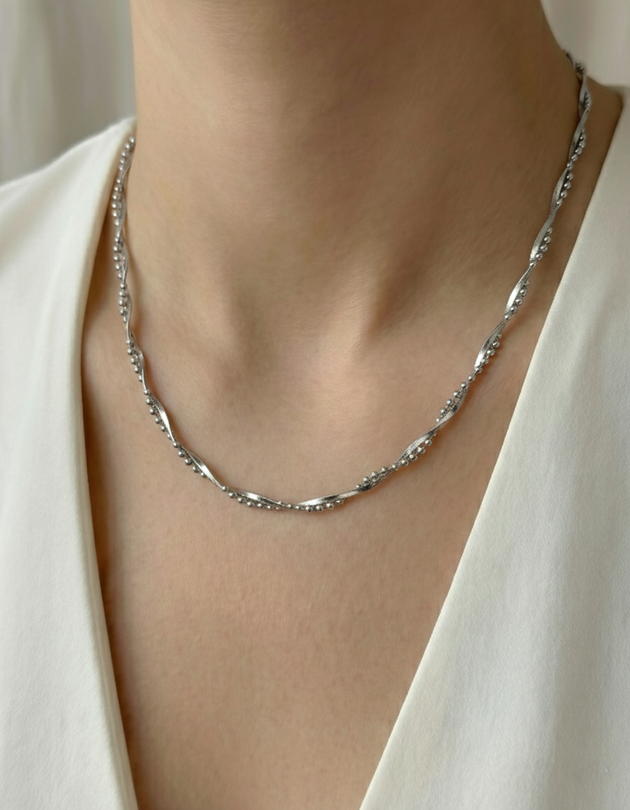 Die geschwungene Kettenstruktur in hochwertiger Silberoptik reflektiert das Licht auf elegante Weise und sorgt für einen dezenten, luxuriösen Glanz.