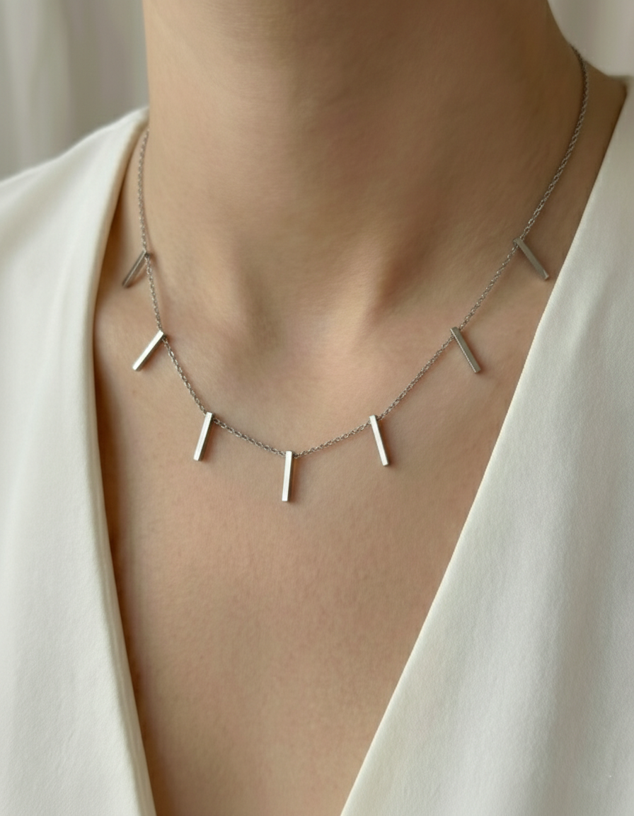 Die feine Kette in edler Silberoptik ist mit stilvollen, länglichen Anhängern verziert, die dem Schmuckstück eine klare und zeitgemäße Ausstrahlung verleihen.