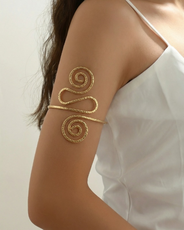Dieser elegante Oberarmreif besticht durch sein auffälliges, kunstvoll geschwungenes Design. Gefertigt in einer goldfarbenen Optik, legt sich das Schmuckstück sanft um den Oberarm und zieht mit seinen spiralförmigen Elementen sofort alle Blicke auf sich. Die fein strukturierte Oberfläche verleiht dem Armreif eine besondere Tiefe und unterstreicht seine edle Ausstrahlung.