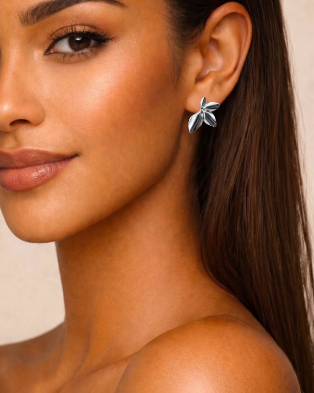 Diese Ohrringe präsentieren sich in einer eleganten, organischen Form in Silberoptik und überzeugen durch ihre klare, glänzende Oberfläche. Das Design besteht aus mehreren fein geformten, blattähnlichen Elementen, die harmonisch miteinander verbunden sind und eine weiche, fließende Struktur bilden. Die glatte, spiegelnde Oberfläche reflektiert das Licht dezent und unterstreicht die ruhige, stilvolle Ausstrahlung. Die ausgewogene Form und die sanften Linien verleihen den Ohrringen eine luxuriöse und zugleich sinnliche Wirkung.