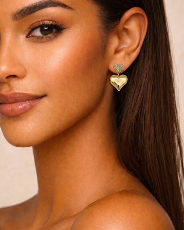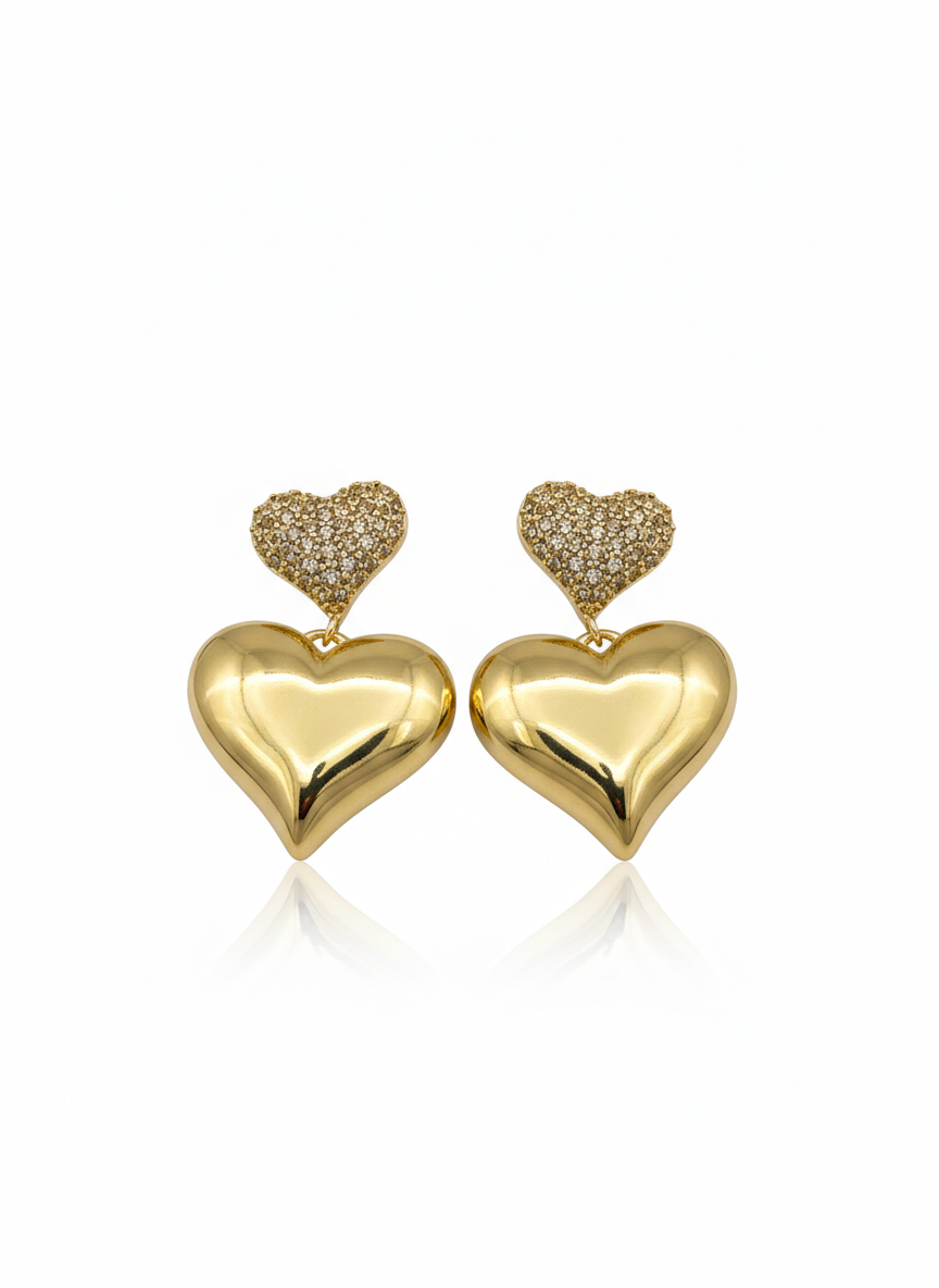 Diese Ohrringe präsentieren sich in einer ausdrucksstarken, herzförmigen Gestaltung in Goldoptik und vereinen glänzende sowie funkelnde Elemente zu einem luxuriösen Gesamtbild. Das obere Herz ist vollständig mit kleinen, klaren, funkelnden Steinen besetzt und sorgt für ein intensives Lichtspiel. Darunter hängt ein größeres Herz mit glatter, hochglänzender Oberfläche, das die Form weich und harmonisch wirken lässt. Die Kombination aus funkelnder Struktur und glänzender Fläche verleiht den Ohrringen eine sinnliche, elegante Ausstrahlung und unterstreicht ihren luxuriösen Charakter.