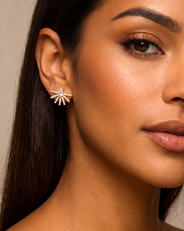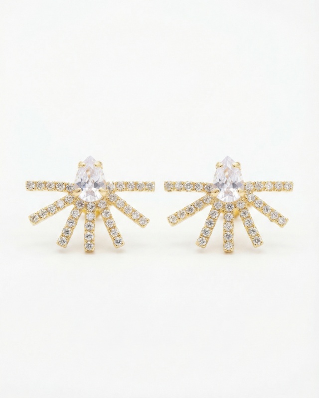 Diese Ohrringe strahlen pure Eleganz und modernen Glamour aus. Das Design erinnert an eine stilisierte Sonne oder ein funkelndes Strahlenbündel, bei dem mehrere, mit Steinen besetzte Linien vom Zentrum ausgehen. Im Mittelpunkt sitzt ein tropfenförmiger, klarer Stein, der das Licht wunderschön einfängt und dem Schmuckstück eine besondere Tiefe verleiht.