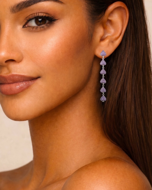 Die Ohrringe sind ein luxuriöses und elegantes Schmuckstück, das sofort ins Auge fällt. Sie bestehen aus mehreren herzförmigen Elementen, die in einer feinen, fließenden Linie miteinander verbunden sind und sanft nach unten fallen. Jedes Herz ist mit funkelnden, violett schimmernden Steinen besetzt, die dem Design eine sinnliche und zugleich edle Ausstrahlung verleihen. Die glänzende Metallfassung unterstreicht den hochwertigen Charakter und sorgt für einen stilvollen Kontrast zu den intensiven Farbtönen der Steine.