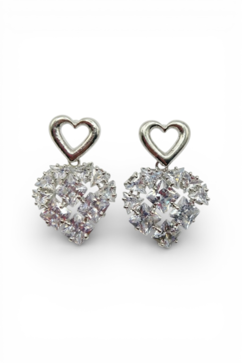 Luxuriöse Ohrringe in silbernem Design mit Herzmotiv und funkelnden Steinen – elegant, strahlend und verführerisch.