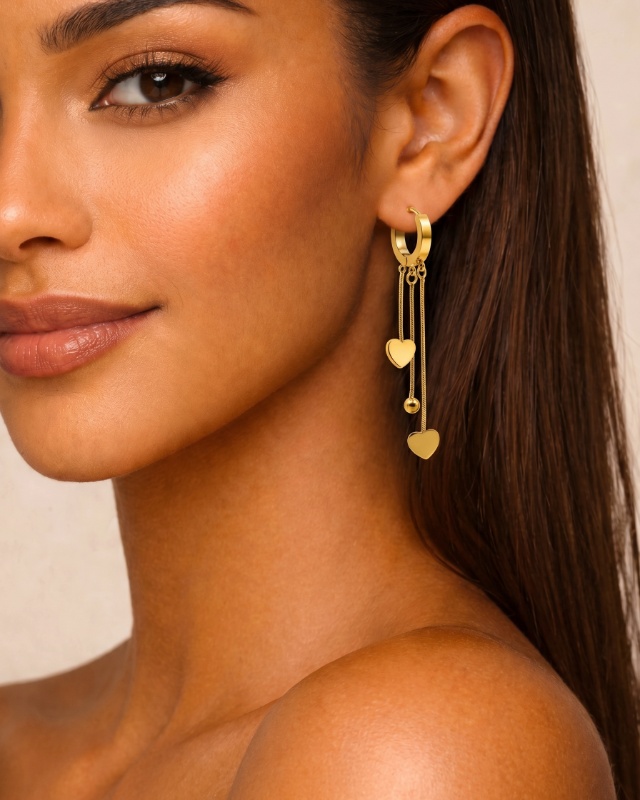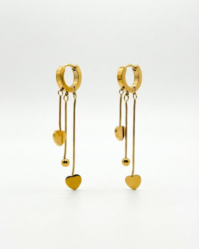 Goldene Creolen mit hängenden Ketten und Herzanhängern – verspielt, elegant und voller Bewegung.