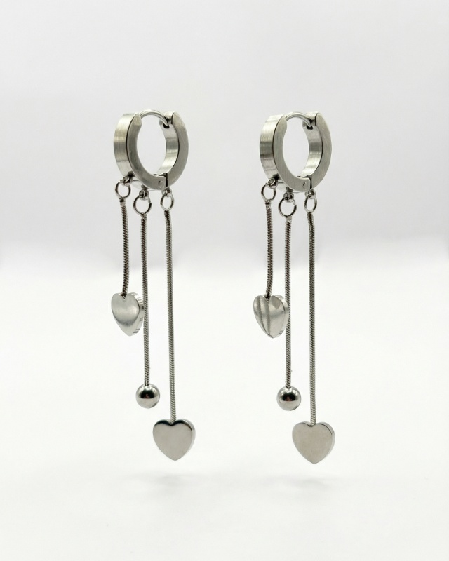 Silberne Creolen mit hängenden Ketten und Herzdetails – modern, elegant und leicht verspielt