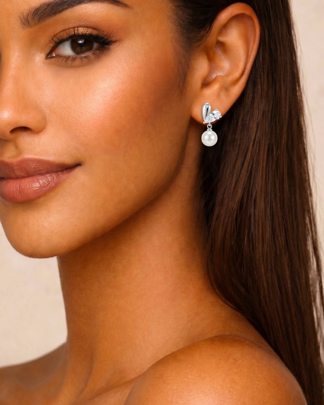Diese eleganten Ohrringe verbinden zeitlose Formen mit dezentem Glanz. Das Design besteht aus einem tropfenförmigen, glänzenden Element, das mit einem kleinen funkelnden Stein verziert ist. Darunter befindet sich ein klarer, facettierter Stein in Tropfenform, der sanft das Licht reflektiert. Den Abschluss bildet jeweils eine runde, glatte Perle, die frei beweglich unter dem Schmuckelement hängt. Die Kombination aus silberfarbenem Metall, transparentem Stein und klassischer Perle sorgt für ein harmonisches und stilvolles Gesamtbild