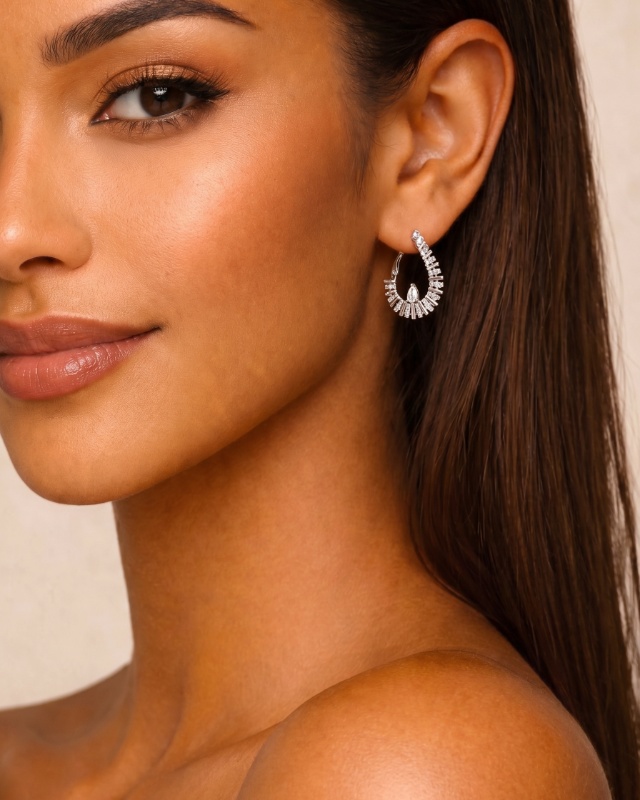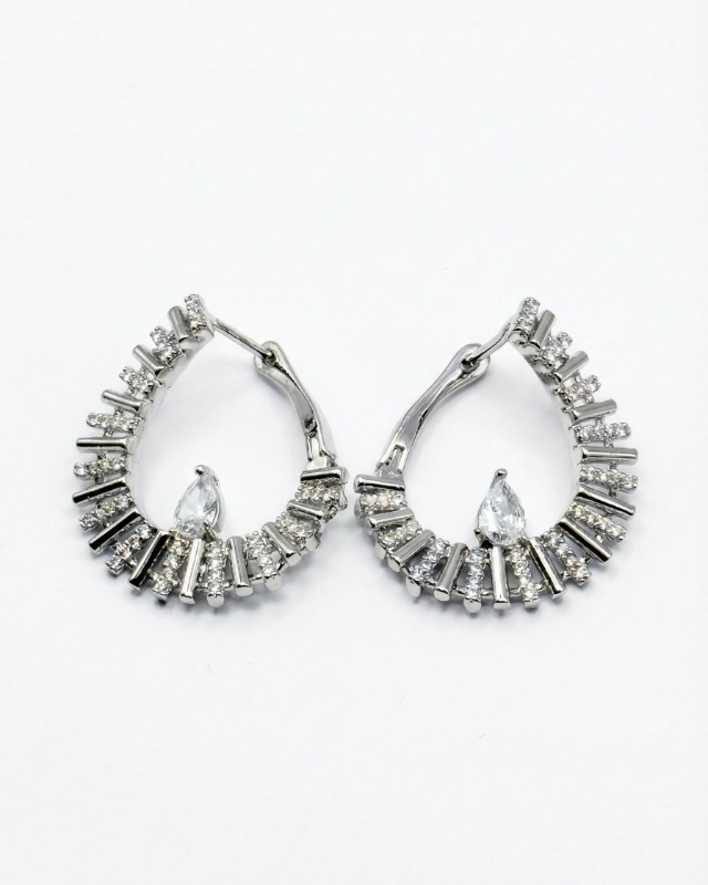 Die Ohrringe sind elegante, silberfarbene Creolen mit funkelnden Steinen und einem tropfenförmigen Detail