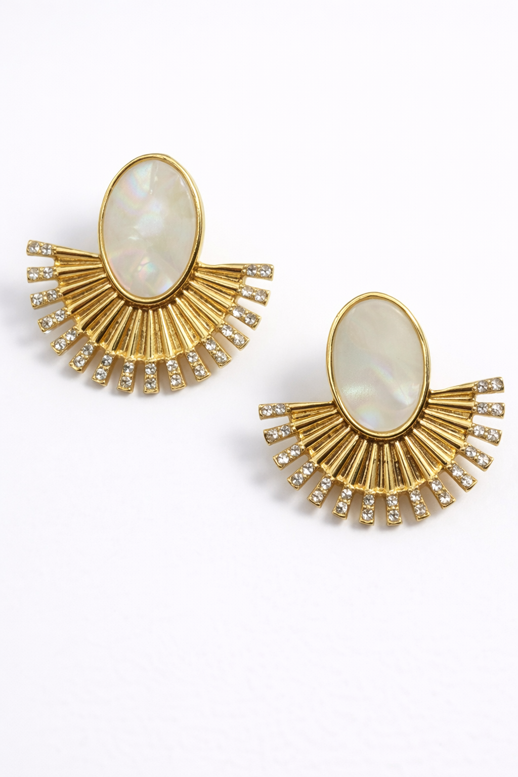 Das Design kombiniert ein ovales, hell schimmerndes Element mit fein angeordneten, goldfarbenen Strahlen. Die unteren Elemente sind teilweise mit kleinen, glänzenden Steinen verziert und sorgen für ein edles, funkelndes Detail.