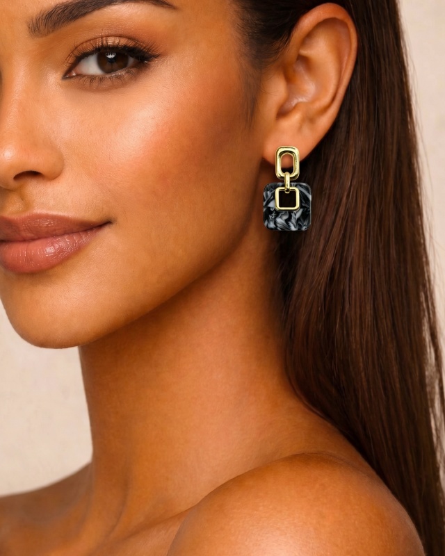 Die Kombination aus goldfarbenen, geometrischen Elementen und einem markanten Anhänger in marmorierter Schwarz-Grau-Optik verleiht diesen Ohrringen eine luxuriöse und zugleich trendbewusste Ausstrahlung. Die klaren Formen und die harmonische Verbindung der einzelnen Elemente sorgen für eine elegante Bewegung und einen edlen Gesamteindruck.