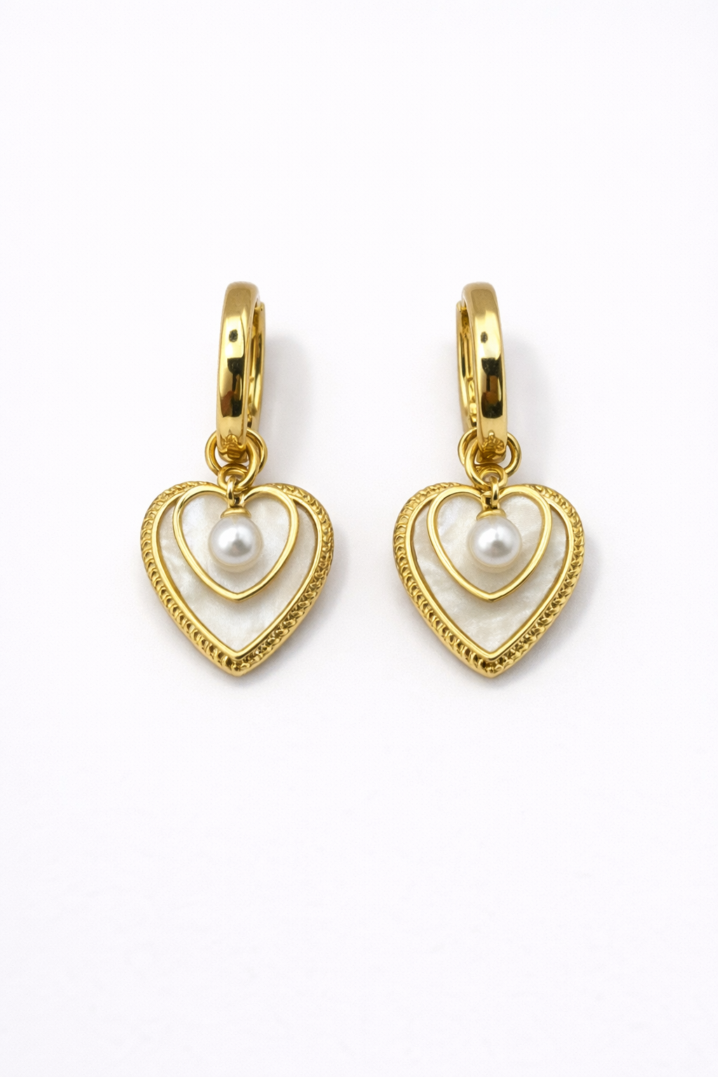 Die Ohrringe sind ein luxuriöses und elegantes Schmuckstück mit einem romantischen und stilvollen Design. An einer glänzenden Creole in edler Goldoptik hängt ein herzförmiger Anhänger, der durch seine feine Verarbeitung besonders hervorsticht. Im Inneren des Herzens befindet sich ein kleineres Herz sowie ein zentrales, perlenartiges Element, das dem Design eine edle und harmonische Ausstrahlung verleiht. Die Kombination aus klaren Formen und sanft schimmernden Details sorgt für einen eleganten und zugleich verführerischen Look.