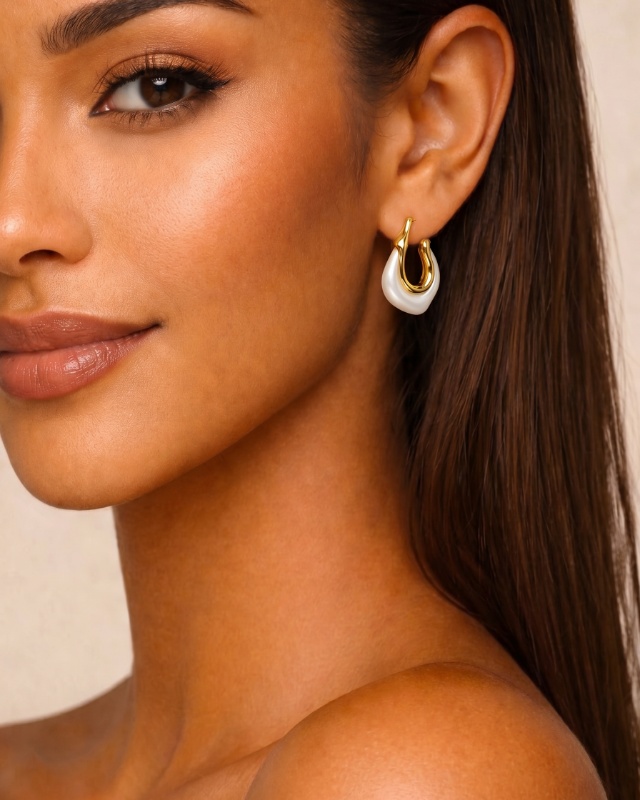 Die Kombination aus glänzenden, goldfarbenen Elementen und der sanft schimmernden Oberfläche verleiht den Ohrringen eine luxuriöse und zugleich moderne Ausstrahlung. Die organische Form sorgt für einen einzigartigen Look und macht dieses Schmuckstück zu einem echten Hingucker.