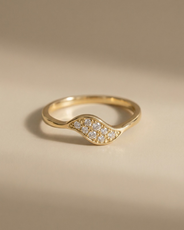 Ein luxuriöser und eleganter Ring mit einer feinen, goldfarbenen Ringschiene. Im Mittelpunkt steht ein geschwungenes, organisch geformtes Element, das mit mehreren kleinen, funkelnden Steinen besetzt ist und dem Ring eine weiche, harmonische Ausstrahlung verleiht. Das zarte Design wirkt modern und stilvoll zugleich und unterstreicht eine sinnliche, verführerische Eleganz. Ein Schmuckstück, das durch seine dezente Form und seinen luxuriösen Glanz besticht.