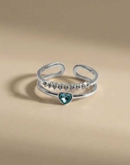 Dieser luxuriöse Ring überzeugt mit seinem eleganten und modernen Design sowie einer sinnlichen Ausstrahlung. Die offene Ringschiene verleiht ihm eine leichte, stilvolle Optik, während eine feine Reihe funkelnder, klarer Steine das Design edel ergänzt. Im Mittelpunkt steht ein herzförmiger, blaugrüner Stein, der dem Ring eine besondere Tiefe und einen ausdrucksstarken Akzent verleiht. Dieses Schmuckstück wirkt luxuriös, feminin und verführerisch – perfekt für einen stilvollen Auftritt.