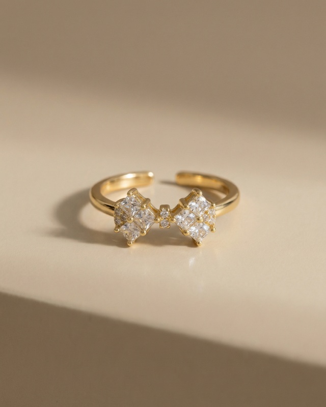Ein luxuriöser und eleganter Ring mit einer feinen, goldfarbenen Ringschiene und offenem Design. Im Mittelpunkt stehen zwei gegenüberliegende, funkelnde Steine, die durch einen kleinen zentralen Stein miteinander verbunden sind und dem Ring eine harmonische, ausgewogene Ausstrahlung verleihen. Die klaren Formen und das glänzende Finish sorgen für einen stilvollen und modernen Look. Dieses Schmuckstück wirkt zugleich sinnlich, verführerisch und luxuriös und setzt einen eleganten Akzent.