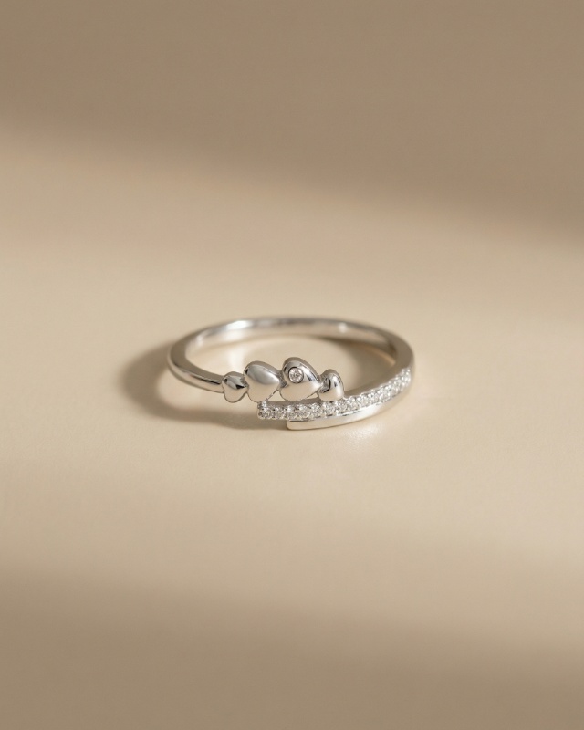 Dieser luxuriöse Ring überzeugt mit seinem eleganten und verspielten Design sowie einer sinnlichen Ausstrahlung. Feine, herzförmige Elemente schmücken den Ring und verleihen ihm eine romantische, feminine Note. Ergänzt wird das Design durch eine zarte Reihe funkelnder, klarer Steine, die für eine edle Brillanz sorgen. Die harmonische Kombination aus glatten Formen und glänzenden Details macht diesen Ring zu einem stilvollen und verführerischen Schmuckstück.