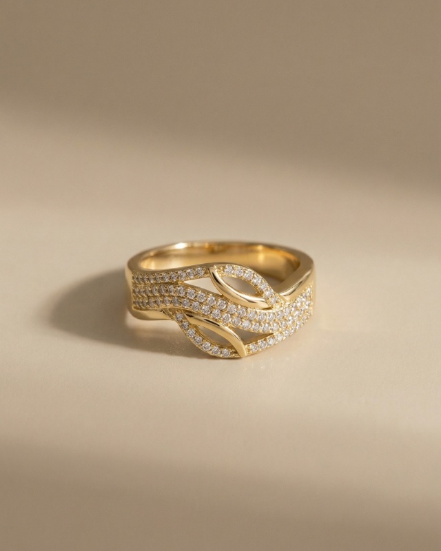 Dieser luxuriöse Ring besticht durch sein elegantes, geschwungenes Design und seine sinnliche Ausstrahlung. Mehrere feine, goldfarbene Linien verlaufen harmonisch ineinander und sind mit zahlreichen funkelnden, klaren Steinen besetzt, die das Licht intensiv reflektieren. Die fließende Form verleiht dem Ring eine moderne, zugleich feminine und verführerische Optik. Dieses Schmuckstück wirkt luxuriös, stilvoll und ausdrucksstark – ein perfektes Highlight für einen eleganten Look.